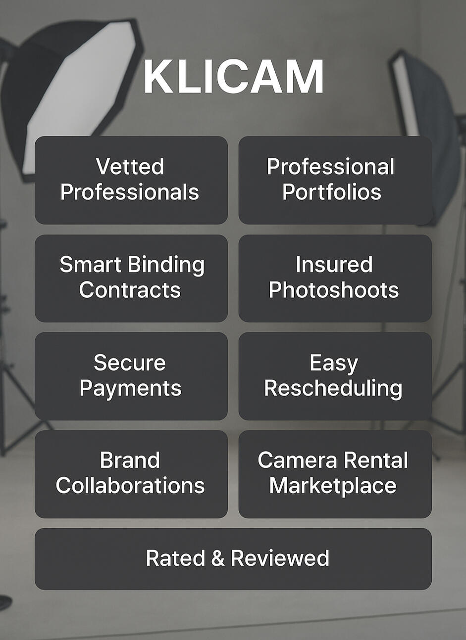 Whether you're a creator looking to elevate your passion or a client seeking the industry's best to capture your special moments,Klicam is your gateway to incredible opportunities.